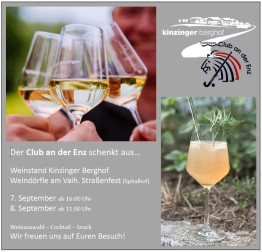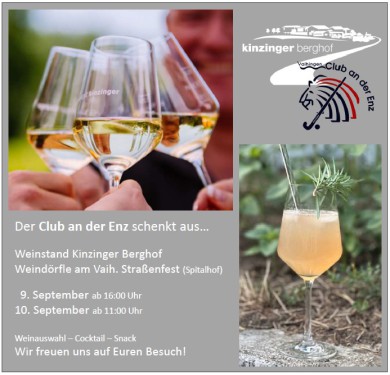 Wir haben wieder die Möglichkeit, den Weinstand Kinzinger beim Straßenfest (Weindörfle) zu bewirtschaften (Getränkeverkauf und Snack). Dies ist für den CEV wieder eine tolle Gelegenheit, unseren Verein bekannter zu machen und Einnahmen für unseren Verein zu generieren.