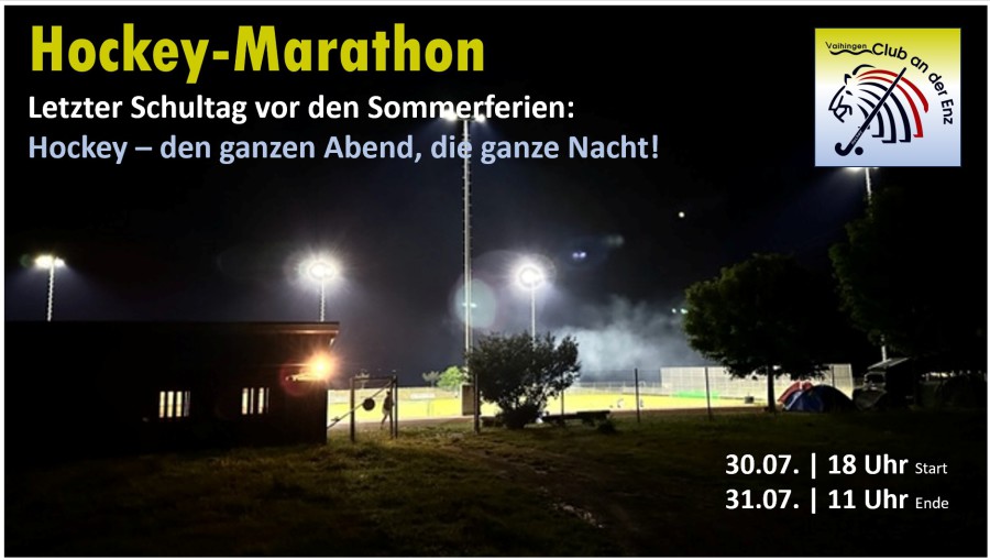 Am Mittwoch, 30. Juli 2025 (letzter Schultag) startet ab 18 Uhr wieder der Hockey-Marathon auf der Platzanlage des CEV: HOCKEY - den ganzen Abend, die ganze Nacht!